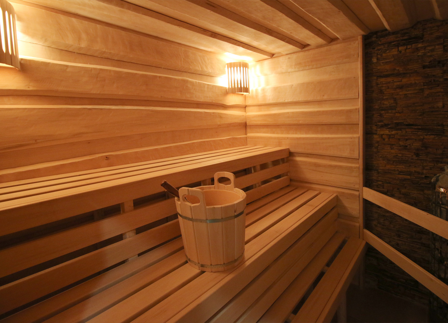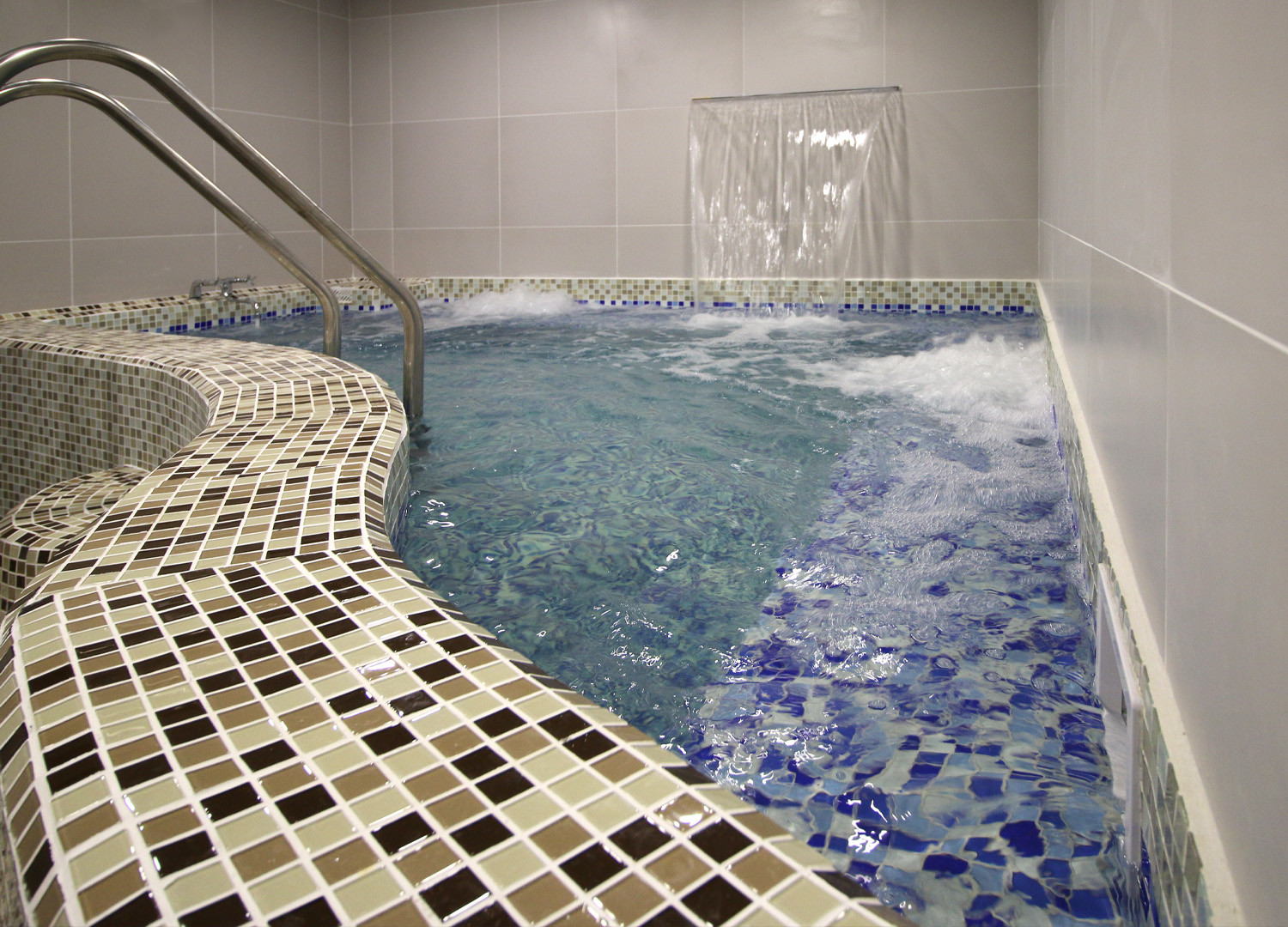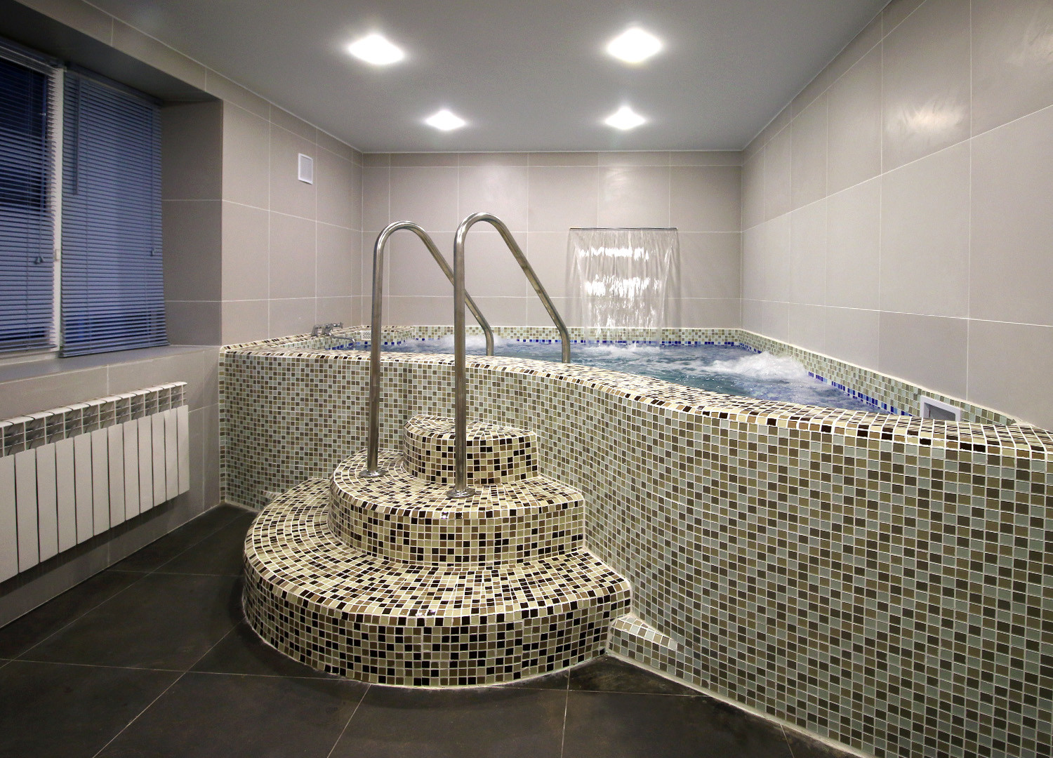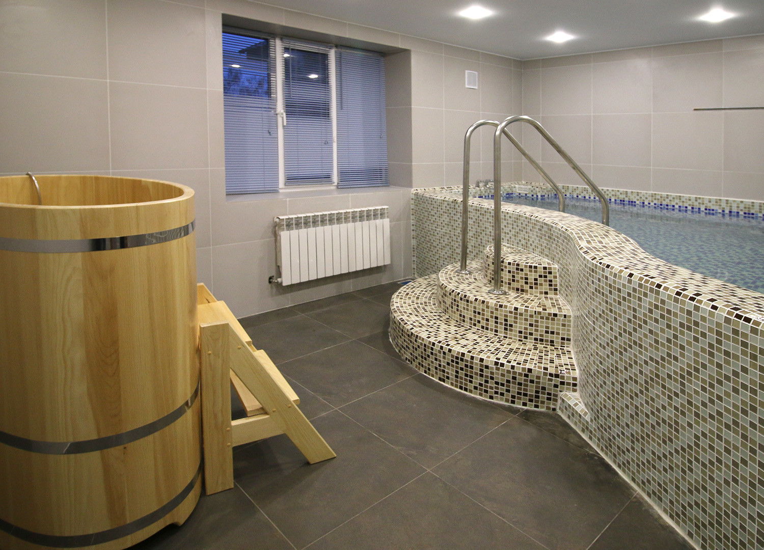 Джакузи с водопадом и гейзером позволит расслабиться и освежиться после жарких процедур. А для любителей экстримального контраста – деревянная кадушка с ледяной водой, в которую можно нырнуть, как в прорубь!