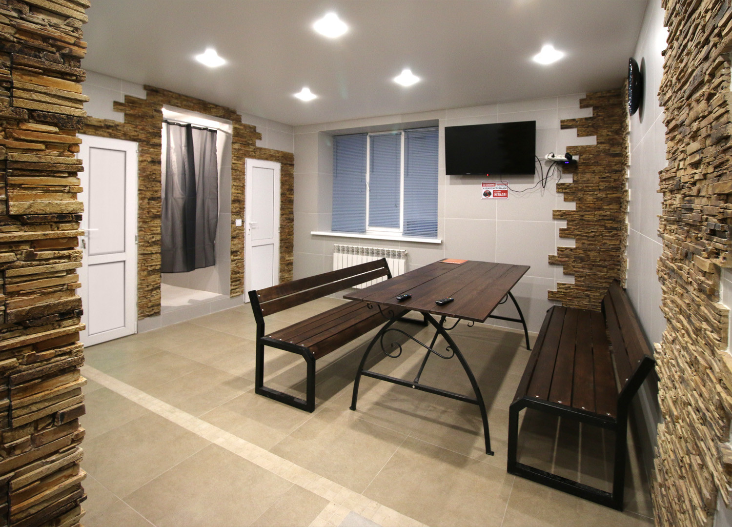 Просторная комната для отдыха с огромным столом подойдет для большой компании.